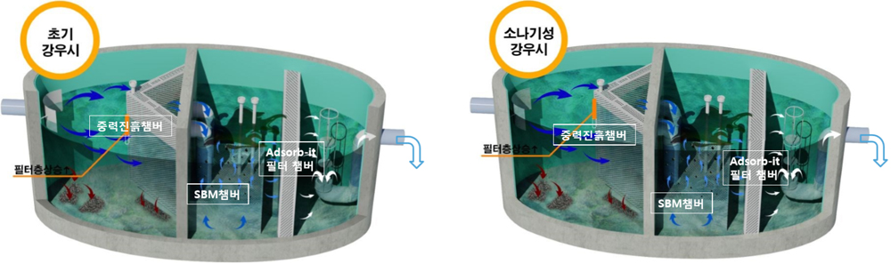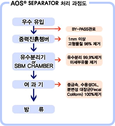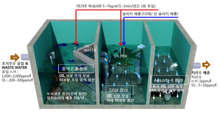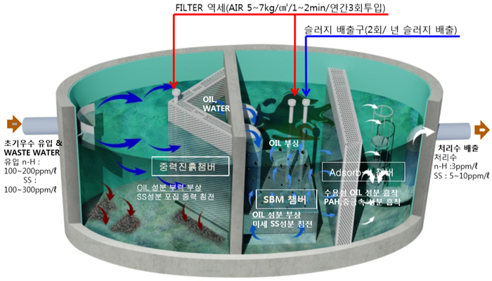 중력진흙챔버 ⇒ 유수분리기 & SBM챔버 ⇒ 여과기(필요에 따라) ⇒ 방류